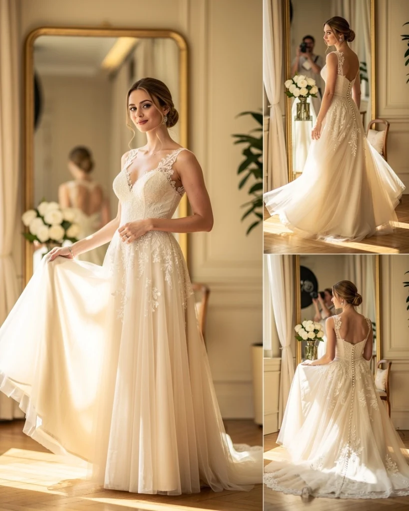 Votre robe de mariée regorge de détails délicats qui méritent d’être mis en lumière. Prenez le temps d’apprécier chaque élément, de la dentelle aux broderies, en passant par les perles et les autres embellissements.